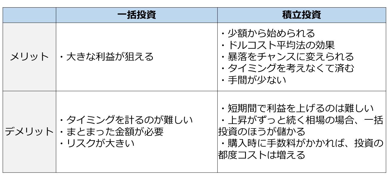 もちろん、ここまでお話ししたとおり、タイミングを計った一括投資は比較的リスクが高いという点は押さえておきましょう。できれば、完全に1回だけの一括投資ではなく、何度かに分けて購入すると、購入タイミングが分散でき、高値で買うリスクを抑えられます。