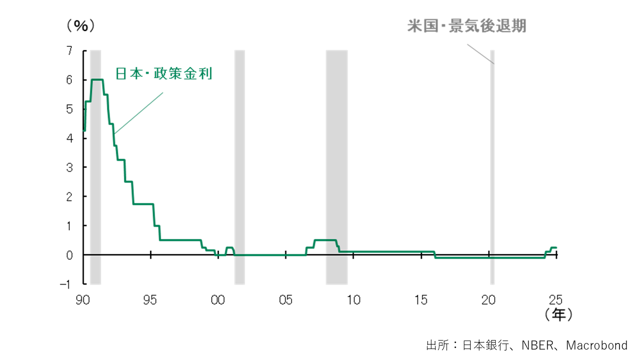 この日本銀行の政策運営を考えるにあたって、大きなポイントになるのは米国経済(ポイント①)です。日本銀行のゼロ金利からの脱却挑戦はバブル崩壊以降、3度目になりますが、過去2回はいずれも米国の景気後退によって頓挫しました(図1)。したがって、米国経済が良好に推移することが日銀の金融政策正常化進展の前提条件になります。