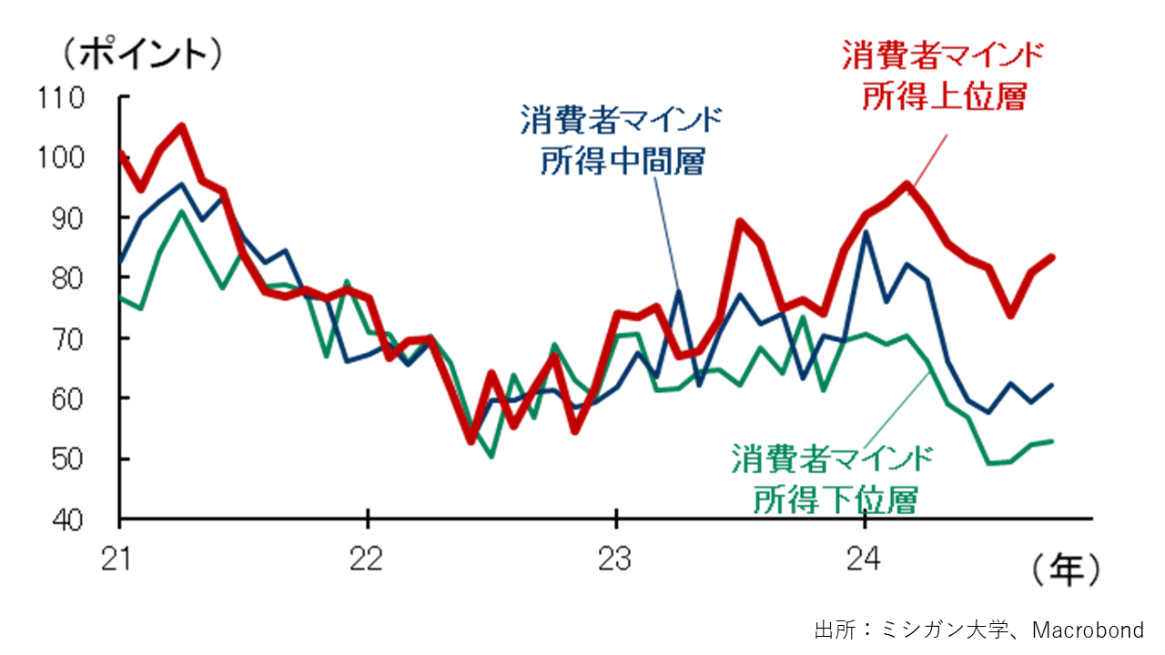特に個人消費が景気を牽引しています。この要因は様々ですが、特に株高が資産効果を呼び起こし、高所得者層の消費を押し上げていると推察されます。所得階層別の消費者マインド(消費意欲を測る統計)をみると、所得層が高いほどマインドは高水準を維持しており、株高による資産効果が大きいことが推察されます。低所得者層については、引き続き高インフレが続いているためマインドは停滞しており、やはり生活のやり繰りに苦労していると考えられます。