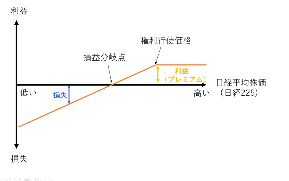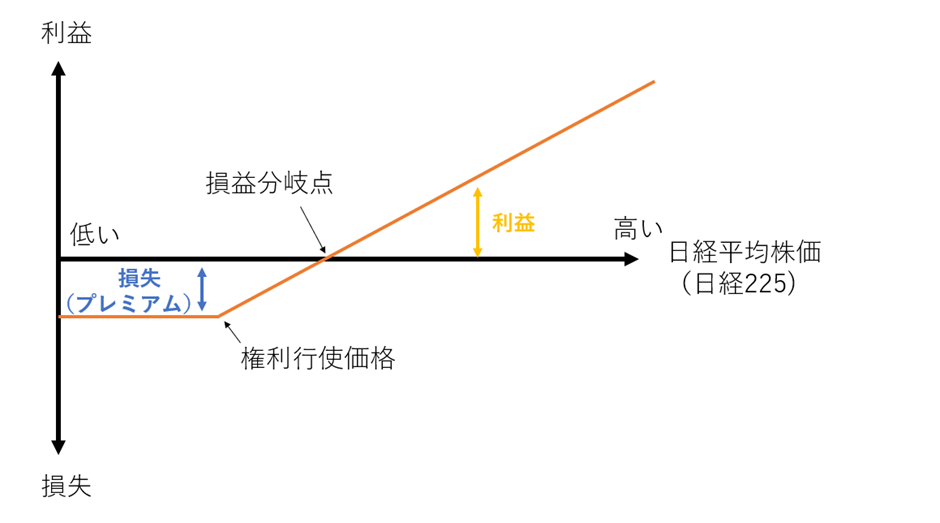 例えば、日経平均株価のコールオプションの場合、日経平均株価が権利行使価格を下回っている場合には権利行使せずにいることができるため損失はプレミアムの分に限定され、日経平均株価が権利行使価格を上回った場合には日経平均株価と権利行使価格との差額がプレミアムを上回れば利益、プレミアムを下回れば損失となります。
