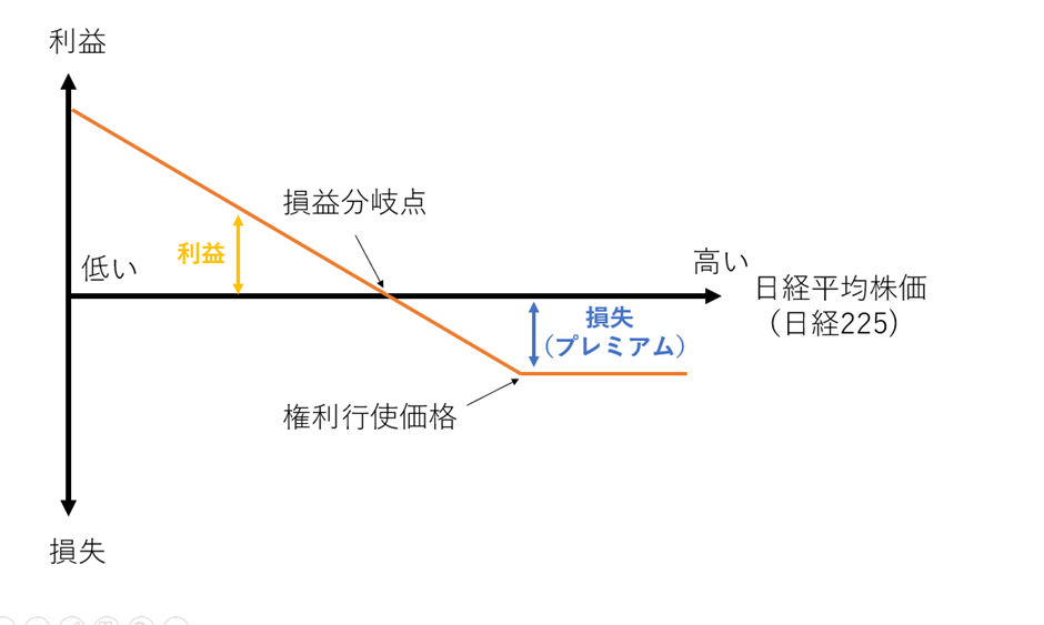 反対に、プットオプションの売りはプレミアムを得て一定の金額以上に下落した場合に損失となります。