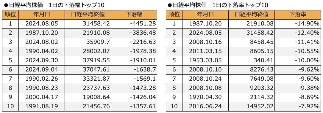 過去の日経平均株価をひも解くと、8月5日の1日の下落幅は過去最大で、下落率も過去2位となっています。下落幅で見ると、8月2日も過去3位になっています。