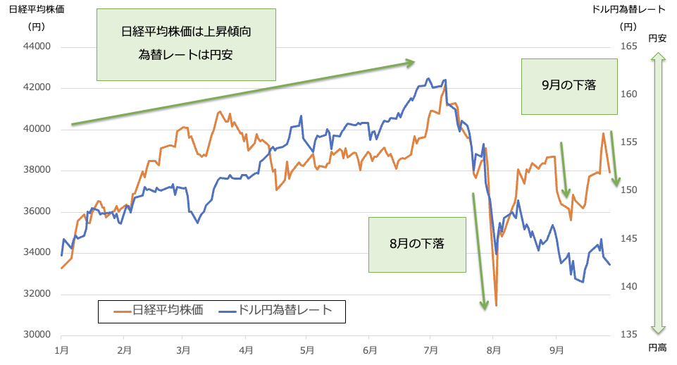<日経平均株価とドル円為替レートの推移(2024年1月〜9月)>