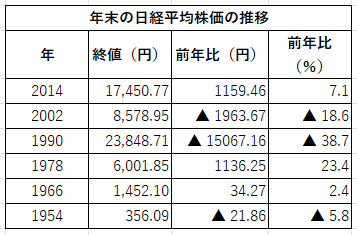 では、「辰巳天井、午尻下がり」は毎回、的中しているのだろうか。日本経済の復興が本格化した1950年代以降の「午年」をみると、「尻下がり」のケースはあと2回ある。前年末比で5.8%安の1954年と同じく18.6%安だった2002年である。