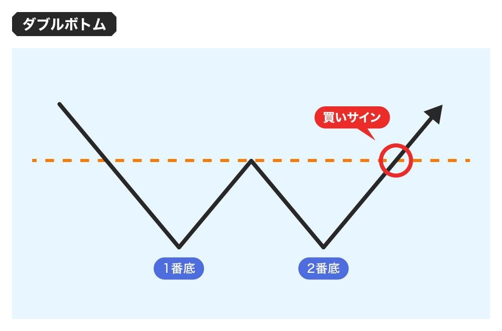 相場の世界ではよく「二番底」を確認してから、買いに転換する投資家が多いと言われます。ほぼ同水準で2回安値をつけた後(2番目の安値が、1番目の安値を割っていないほうが信頼度は高い)に、直近高値を超えていくという形です。