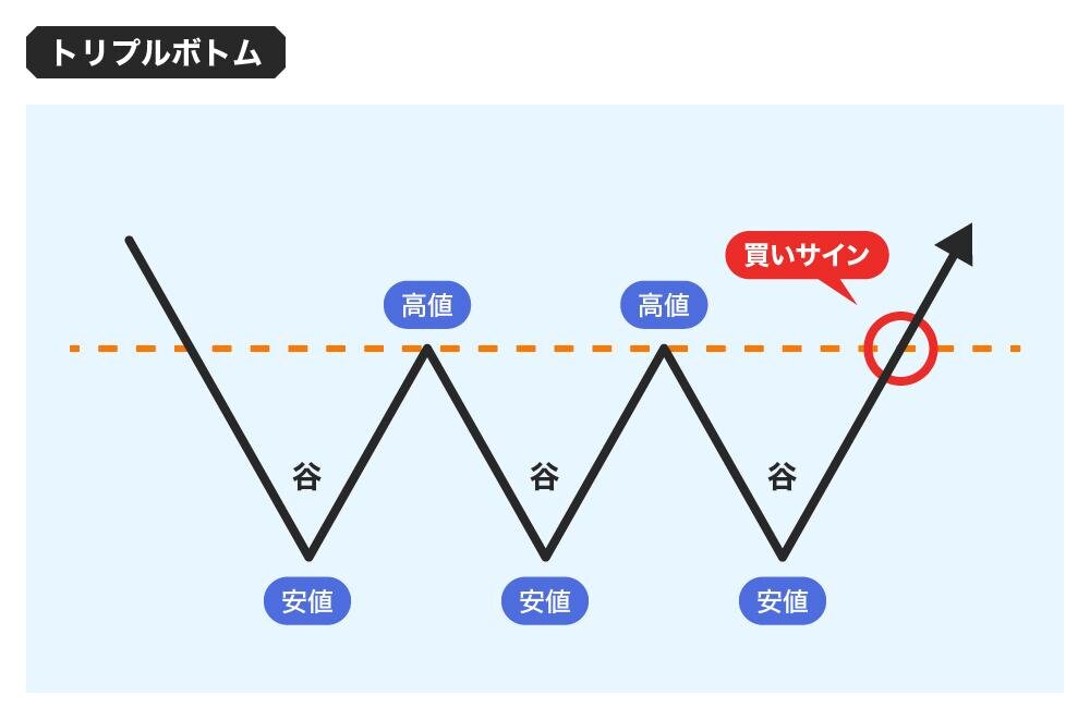 最後にトリプルボトムです。こちらも王道ですが、考え方は、ほぼダブルボトムと同じです。トリプルボトムは、ほぼ同水準の安値を3回付けています。真ん中の安値が明らかに低い場合は、ヘッドアンドショルダーズボトムのチャートパターンで、同水準の場合がトリプルボトムです。