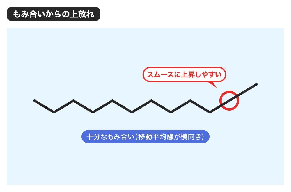 安値圏でもみ合っている状態というのは、買いと売りのバランス(需給)が拮抗している状態です。そのバランスが崩れるタイミングが「上放れ」になります。