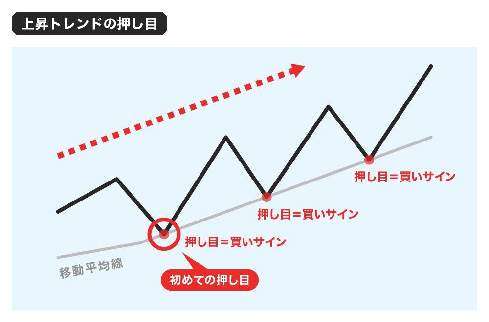 ここで特に意識したいのが、上昇トレンドに転換後に最初につける押し目で、「初押し」などと呼ばれたりします。