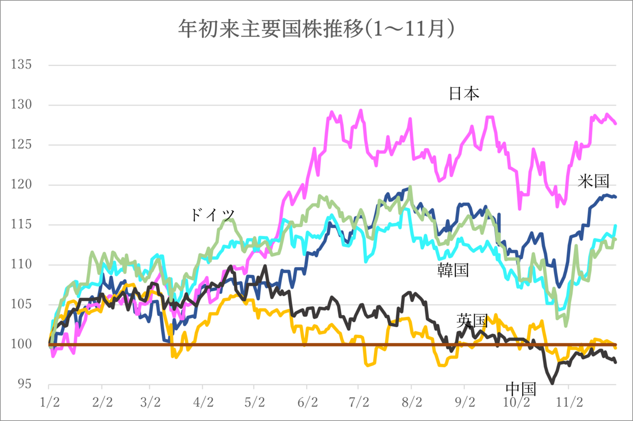 それは年初来11か月間の株価のパフォーマンスにも表れている。日経平均株価の+28%は、「米国SP500」+19%、「ドイツDAX」+15%、「英FT100」 0%、「中国上海総合」-2%、「韓国総合」+13%と主要国株価の中で突出している。
