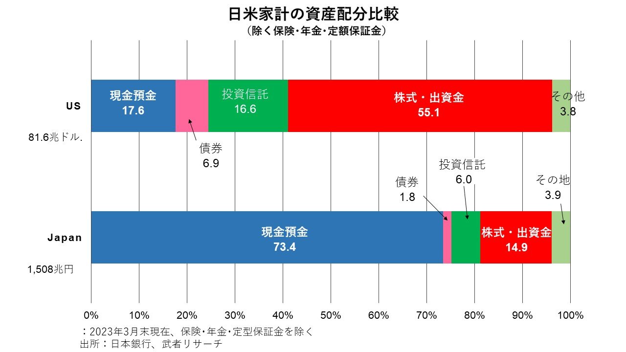 米国は家計金融資産(年金・保険の積立金を除く)82兆ドルの内72%が株式と投信に振り向けられ、現預金は18%に過ぎない。対して日本は利息ほぼゼロの現預金に1500兆円の金融資産のうち73%も滞留させ、配当だけでも2%、社内留保を含めれば7%ものリターンがある株と投信には20%しか投資していない。日本の家計に眠るこの巨大な資金1100兆円がNISA改革によって大きく動こうとしているのである。今や外国人も、個人も企業も年金などの機関投資家も日本株を持たざるリスクにおびえ始める状況である。