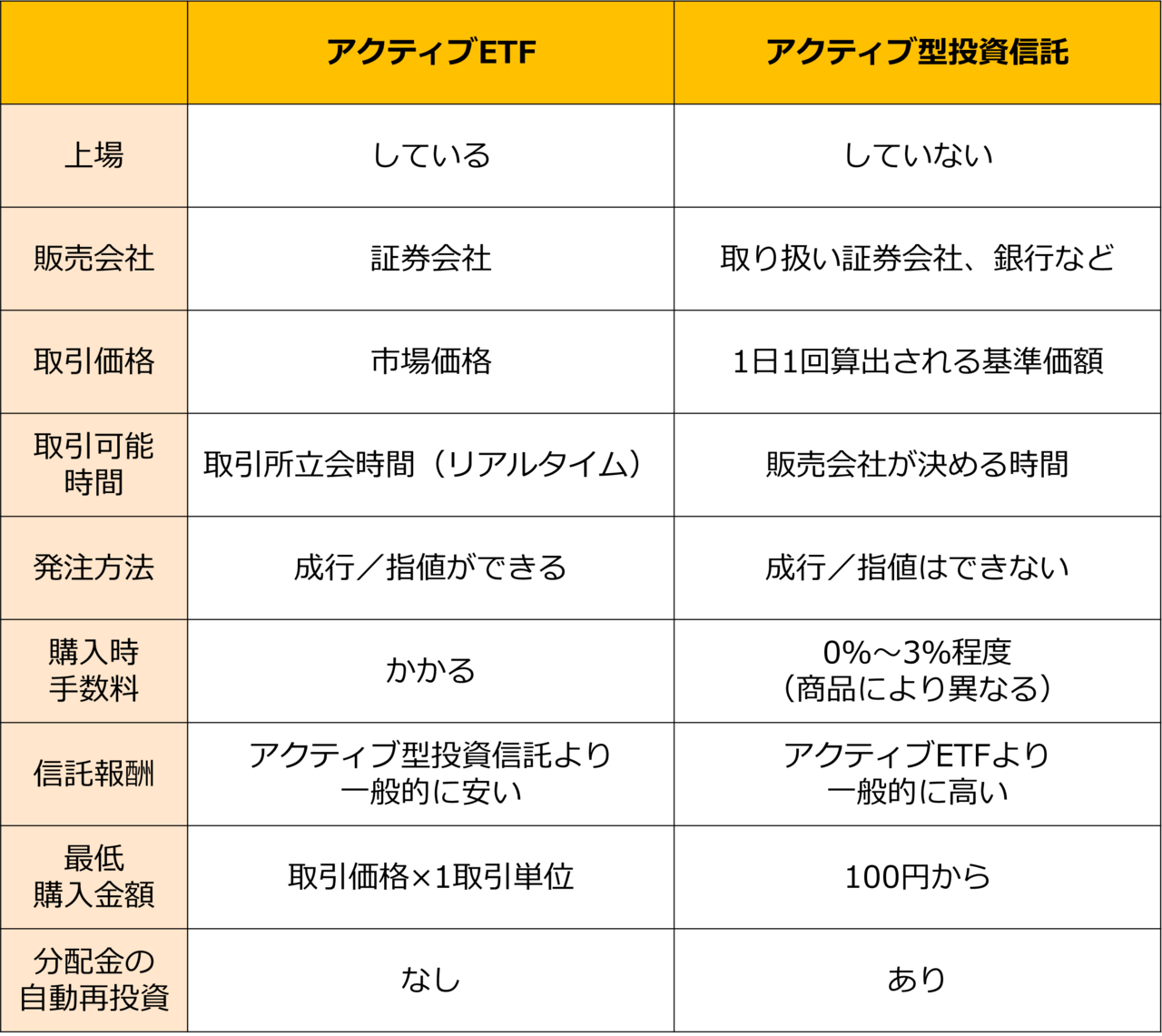 アクティブETFとアクティブ型投資信託の最大の違いは「証券取引所に上場しているか、していないか」です。ETFは証券取引所に上場していますが、投資信託は上場していません。投資信託は1日1回算出される「基準価額」(投資信託の値段のようなもの)をもとに取引します。株のような成行・指値の注文はできません。