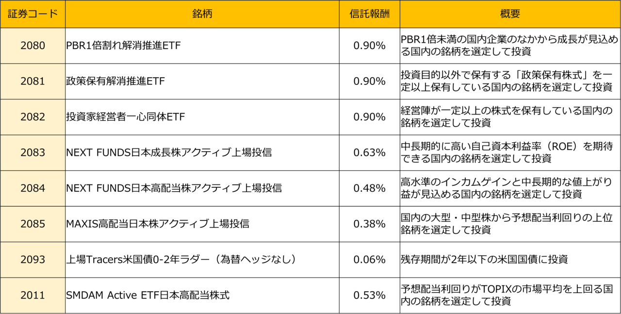アクティブETFは、 2023年11月21日時点で8銘柄が東証に上場しています。