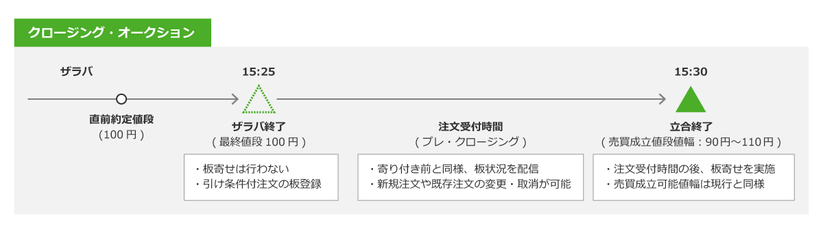 これまではザラ場が終わると、15時に板寄せ方式(更新値幅2倍)で終値が決められていましたが、今回の変更によりザラ場取引が終了後、15時25分から5分間オークションが行われ、その後15時30分に板寄せ方式で終値が決められることになりました。