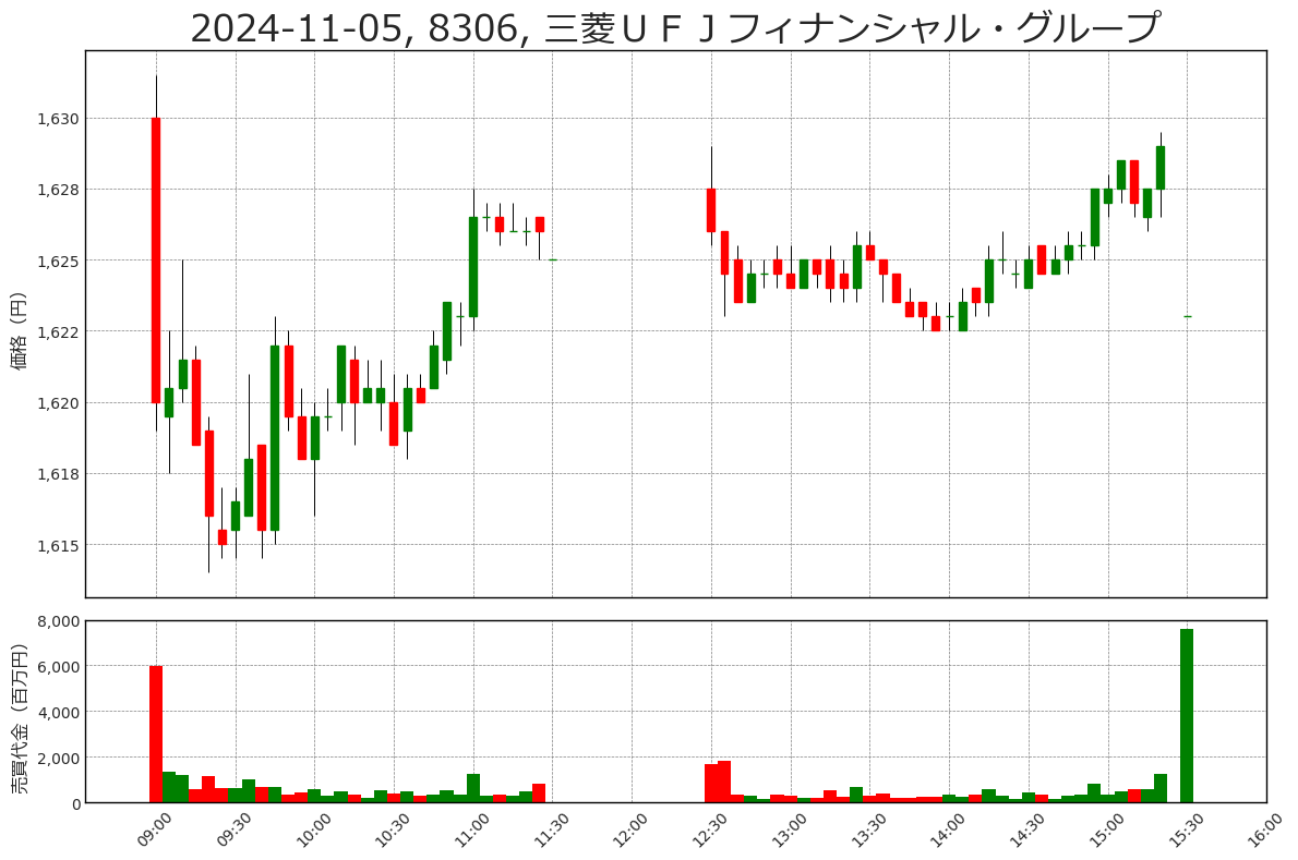実際にどうだったのか、11月5日の8306 三菱UFJフィナンシャル・グループで確認してみました。
