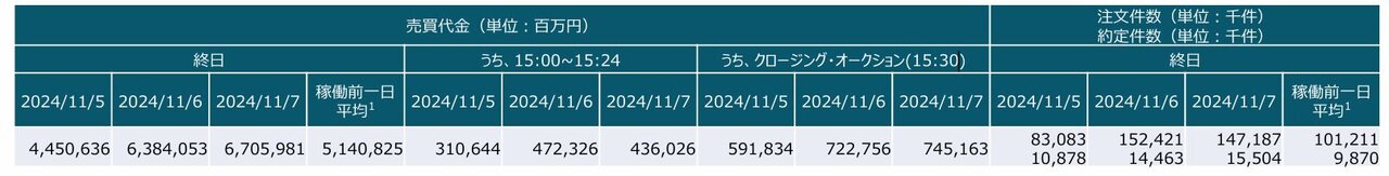 11月6日と7日には通常通りの約定率に戻っていることを考えると、高速取引業者というシェアの高い主体の取引が新制度導入初日に様子をみて、翌日からは通常通りに動いたということがこのデータを見るとわかります。