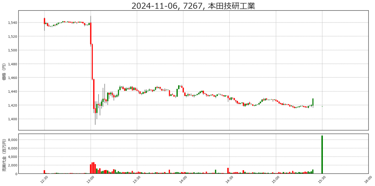 上記は6日の7267 本田技研工業の決算後の株価チャートです。