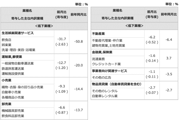 まずはアフターコロナの現状について確認したいと思います。2020年初旬には、新型コロナウイルスの感染が拡大し、特に「生活娯楽関連サービス」「卸売業」「小売業」などの業界は大打撃を受けました(図1)。最も落ち込みの大きかった2020年4月には、前年同月比で「生活娯楽関連サービス」-50.8%、「運輸業」-20%、「小売業」-14.4%と急激な落ち込みを記録しました(図1)。