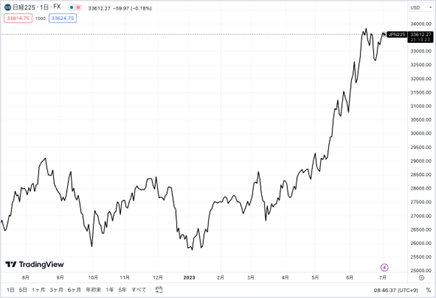 まず日本株全体の状況ですが、いま日本株は海外からも注目を集めており非常に好調です。日経平均は33年ぶりの高値の3万3,700円台を付ける場面もありました(図5)。要因はいくつかありますが、著名投資家の