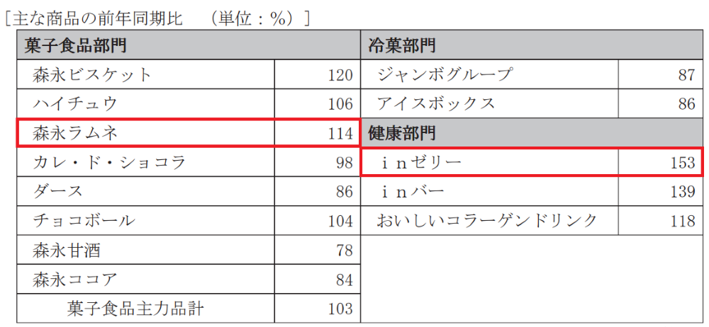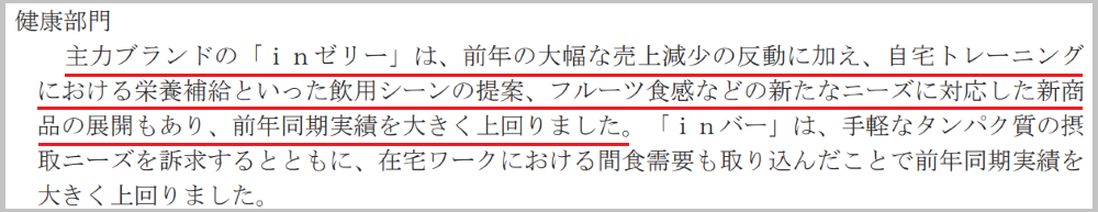 売上げの増減の背景は決算短信に書いてあることも。例えば、inゼリー売上げ増の背景については、飲用シーンの提案などが言及されている。