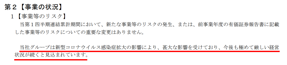 ANAホールディングス株式会社の第71期(2020年4月から2021年3月)の第1四半期報告書では、新型コロナウイルス感染症拡大の影響で、長期的に厳しい状況が続くであろうことが書かれている