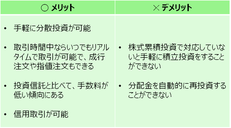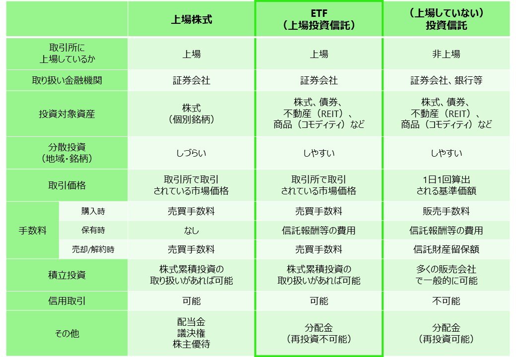 ETFを活用する場合のメリットやデメリットについて、上場株式や投資信託と比較しながら考えていきましょう。次の表をご覧ください。