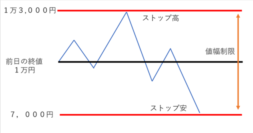 また、ストップ高・ストップ安の状態でその日の取引が終了すると、翌営業日の取引はその終値からの値幅制限が適用されます。ただし、値幅制限を変更する場合もあります。