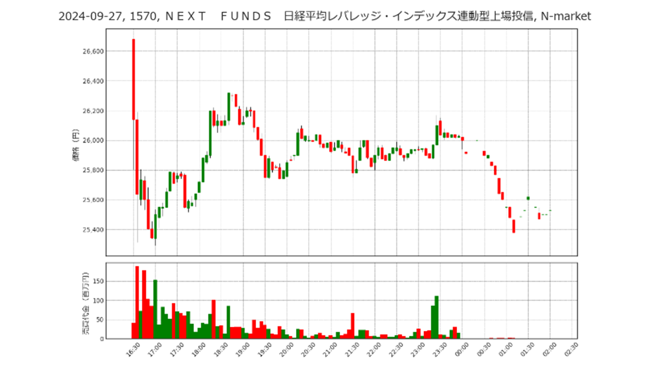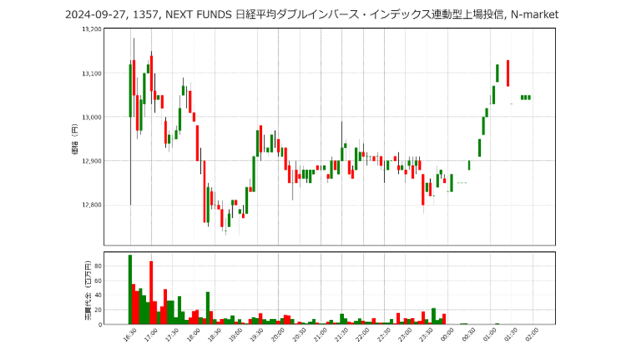 9月27日の東京株式市場の通常取引は前日比903円高で終了。高市氏は金融緩和に肯定的とみられ、円安・株高が期待されることから、1回目に東証で同氏がトップの票を獲得すると、引けにかけて上昇が加速する展開(高市トレード)でした。しかし、通常取引終了後に、石破氏の勝利が決まったため、9月30日の取引で「高市トレード」の巻き戻しによる株価下落が予想されることになりました。9月27日の夜間取引は、30日の株価変動に備える動きが増え、「日経平均レバレッジ・インデックス」の取引が増えたと理解されます。30日に価格上昇が期待された「日経平均ダブル・インバース」の取引も膨らみました。