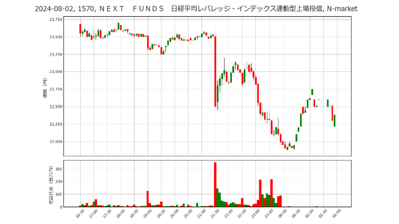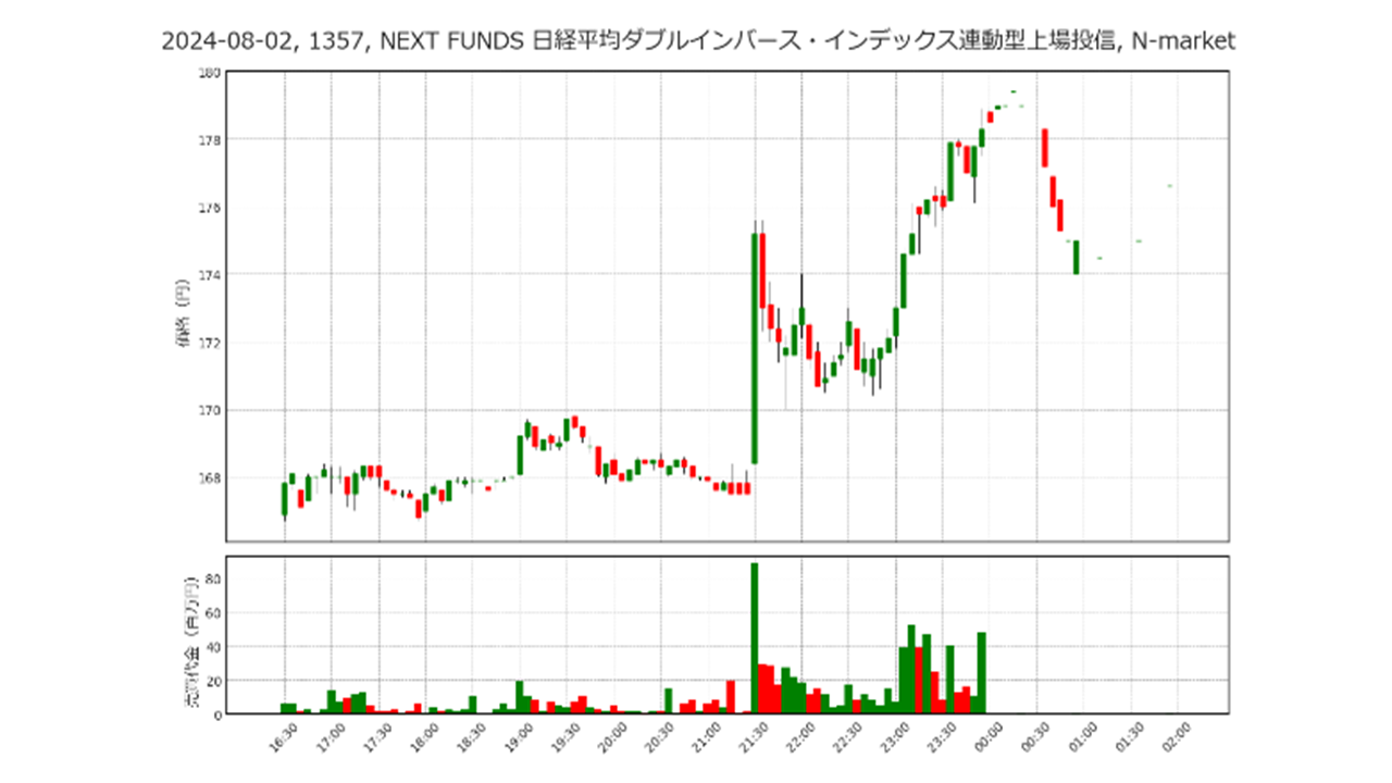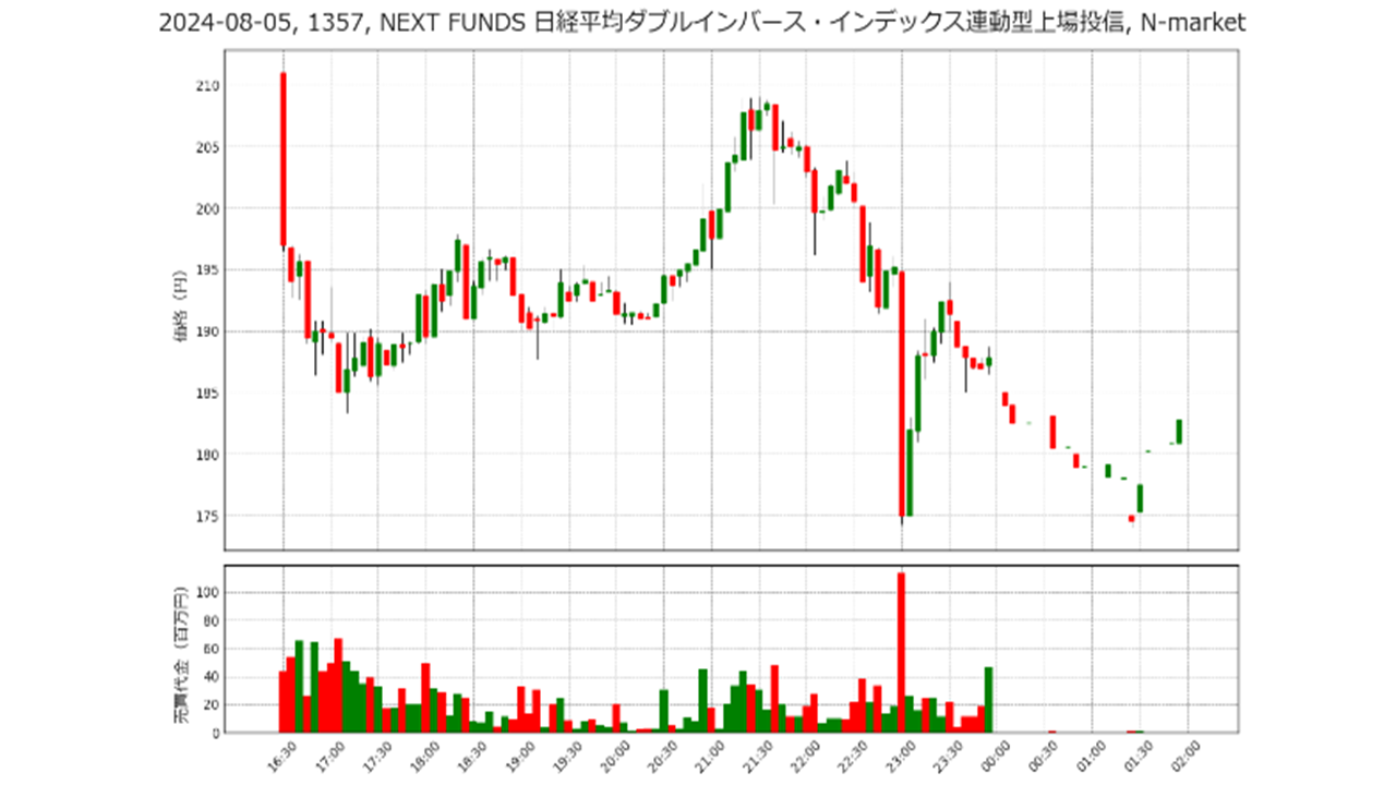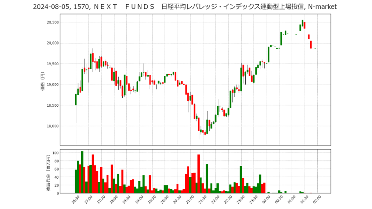 歴史的な株価急落は、投げ売りを誘う一方、これまで市場に参加していなかった新規の買いを誘う側面があります。歴史を参考にするならば、87年10月ブラックマンデーによる下げについても、翌営業日は大幅高でした。8月5日の夜間取引は、相場下落を受けた強弱感の対立から「日経平均レバレッジ・インデックス」や「日経平均ダブル・インバース」の商いが膨らんだとみられます。