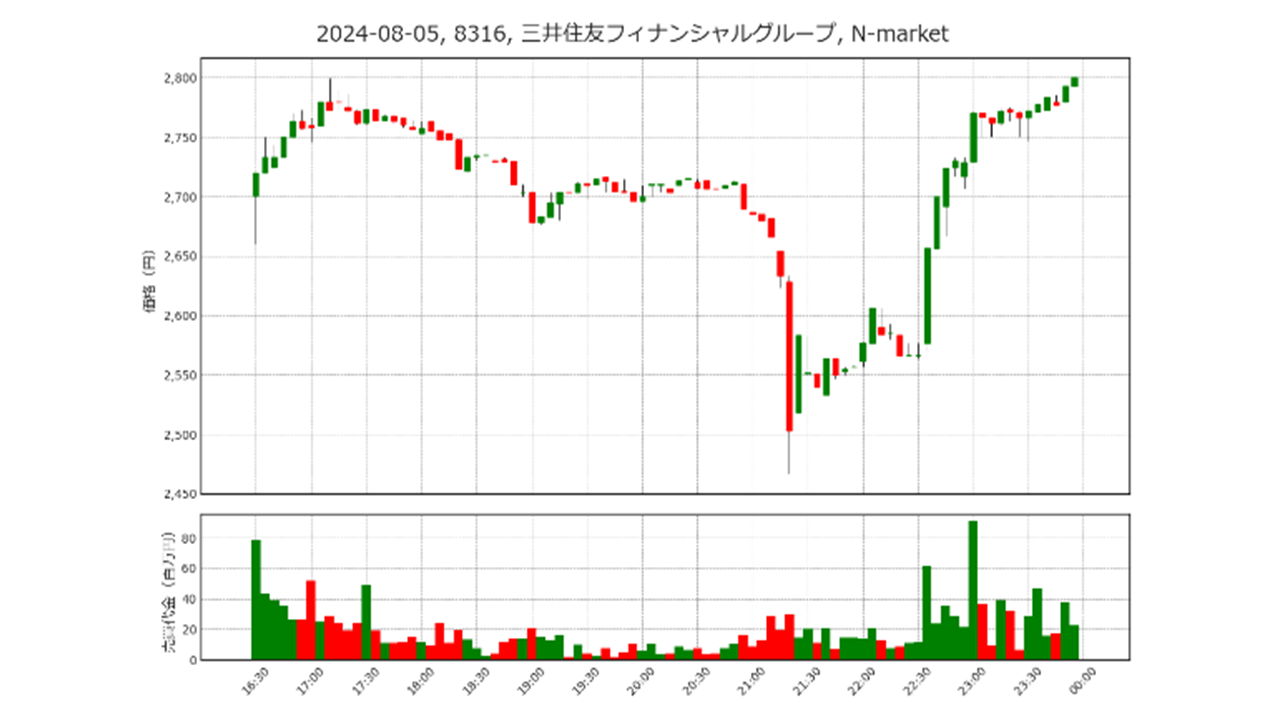 なお、第3位の三井住友(8316)ですが、8月2日に25年3月期第1四半期の決算を発表し、3つのメガバンクの中では純利益の伸びが最大になりました。普通であれば8月5日の取引では買い優位になりそうですが、上記の市場全体の波乱を受け、それまで株価が上昇傾向だったこともあり、この日はストップ安となりました。ただ、好決算に加え、日銀の金融引き締め自体も追い風と考えることもでき、夜間取引から反発狙いの買いが入ったとみられます。