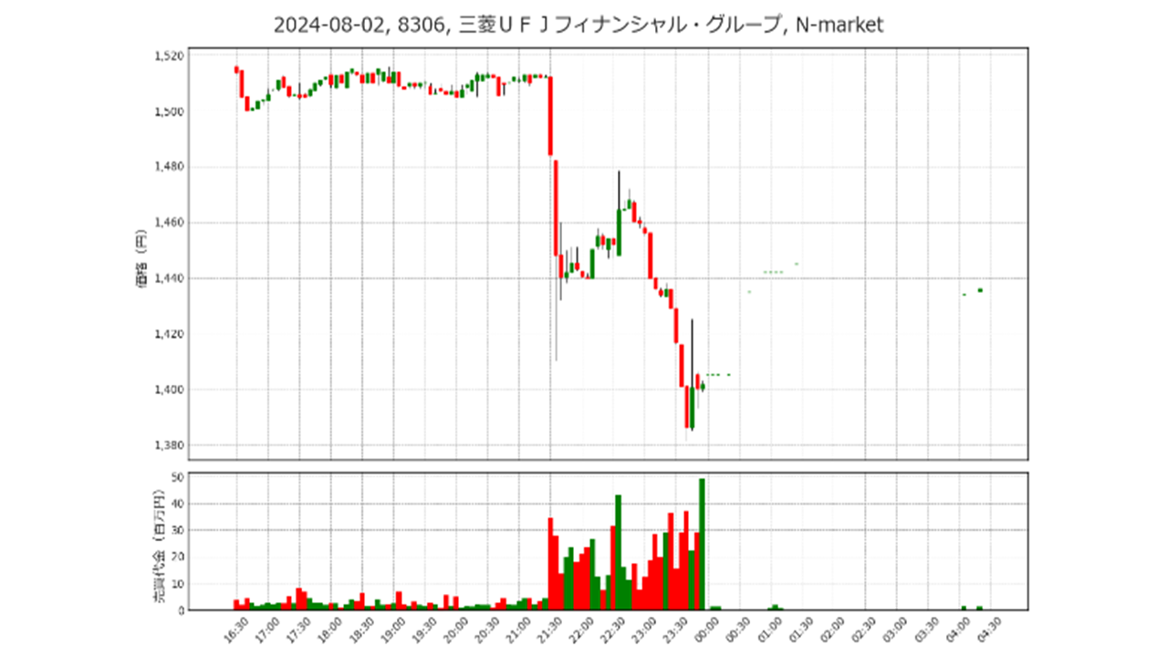上述した、日経平均株価が過去最大の下げ幅となった8月5日(月)の前営業日に相当します。8月2日(金)は米国株式市場が雇用統計の下振れを受け、景気悪化懸念から大幅安となりました。週明けの株価波乱に対応すべく、「日経平均レバレッジ・インデックス」や「日経平均ダブル・インバース」の夜間取引が膨らんだとみられます。やはり上述した日米期の金融政策の方向感の違いが意識され、ボラティリティも拡大しつつありました。8月5日と異なり、商いが膨らんだ銀行株が三菱UFJとなったのは、同社の第1四半期決算発表が前日の8月1日であったため、その評価を巡る売買が相対的に入りやすかったと考えられます。