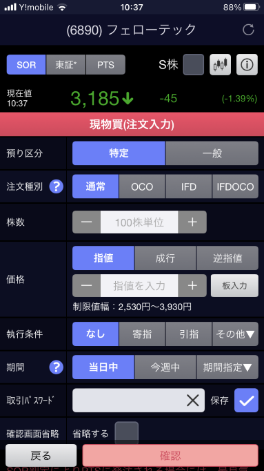 森口さんよりご提供頂いた画面(SBI証券の株アプリ注文画面より)