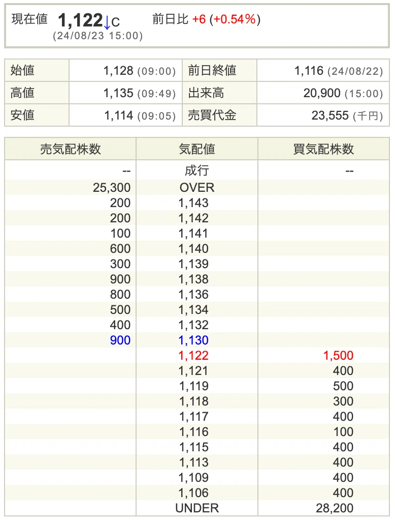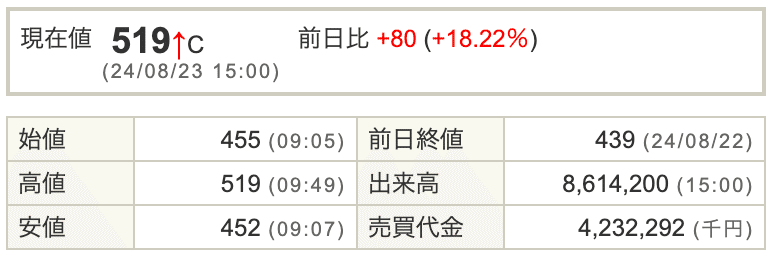 (SBI証券より 8月23日終値 ストップ高で終了)