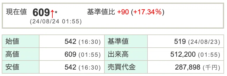 通常であれば、土日を挟んで月曜日まで取引を待つ必要がありますが、この短期間での大きな上昇と当日のストップ高により注目を集めていた同社は、当日の夜間取引で、さらに17%以上の上昇が見られました。