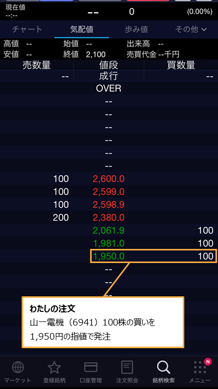わたしは、好決算に見えても売られるといったトラップを避けるため、決算発表翌営業日は売買しません。値動きを見てから判断することにしていますので、8日(月)の値動きを見て、その日の夜間に買おうと決めました。日中取引の終値は2,100円でしたが、それより安い1,950円で指値注文を出しました。