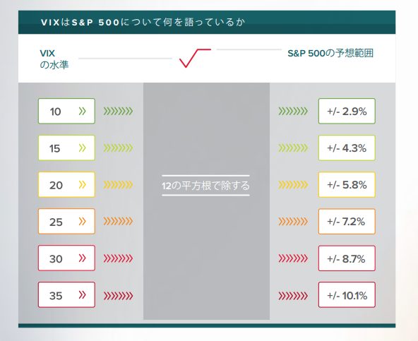 たとえば、VIX指数が20であれば、S&P500は今後30日間でおよそ±5.8%の範囲で推移することが予想されます。VIX指数が30であれば±8.7%、VIX指数が10なら±2.9%といった具合です。以下はVIX指数水準とS&P500の予想変動範囲の関係をまとめたものです。