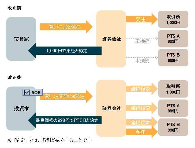 上図の「改正前」は、証券会社が取引所にしか接続していないため、個人投資家の買い注文は、1,000円で約定します。これに対して、上図の「改正後」は、証券会社が、取引所とPTSに接続して価格を比較するので、最も安いPTS Bの998円で約定します。このように、取引所とPTSの気配を比較し、最良価格での約定が期待できるようになります。