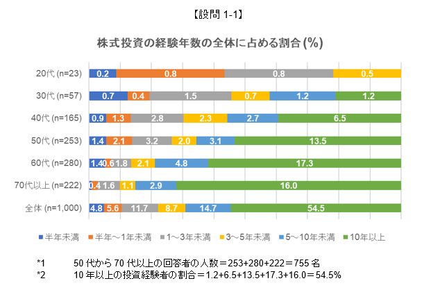 約75%*1の回答者が50代以上、全体としては半数以上*2の回答者が10年以上株式投資の経験がある投資家でした。比較的長期間の投資経験を積んでいる投資家から回答が多く寄せられる結果となりました(設問1-1参照)。