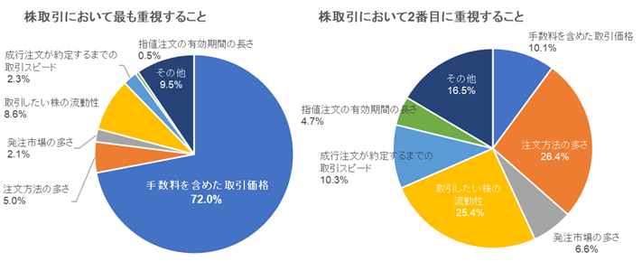 設問3への回答からは、回答者の70%以上が、株取引において「手数料を含めた取引価格」を最も重視していることがわかります。